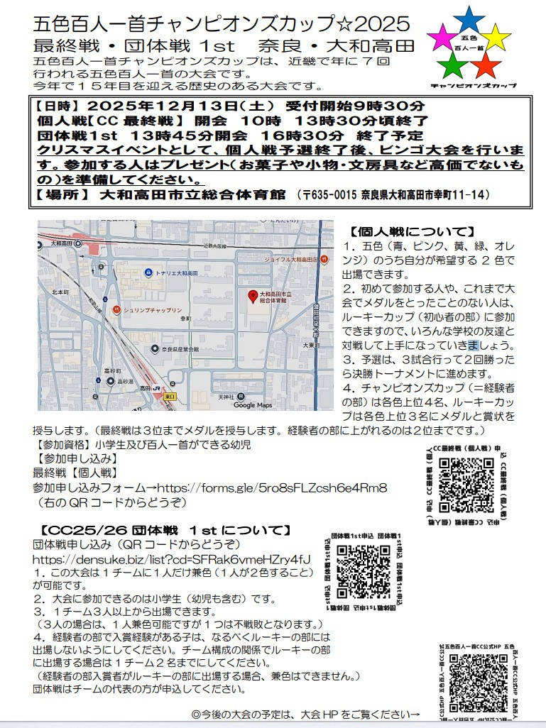【場所】大和高田市立総合体育館)(〒635-0015 奈良県大和高田市幸町11−14 )クリスマスイベントとして、個人戦予選終了後、ビンゴ大会を行います。参加する人は各自プレゼント(お菓子や小物・文房具など高価でないもの)を準備してください。
